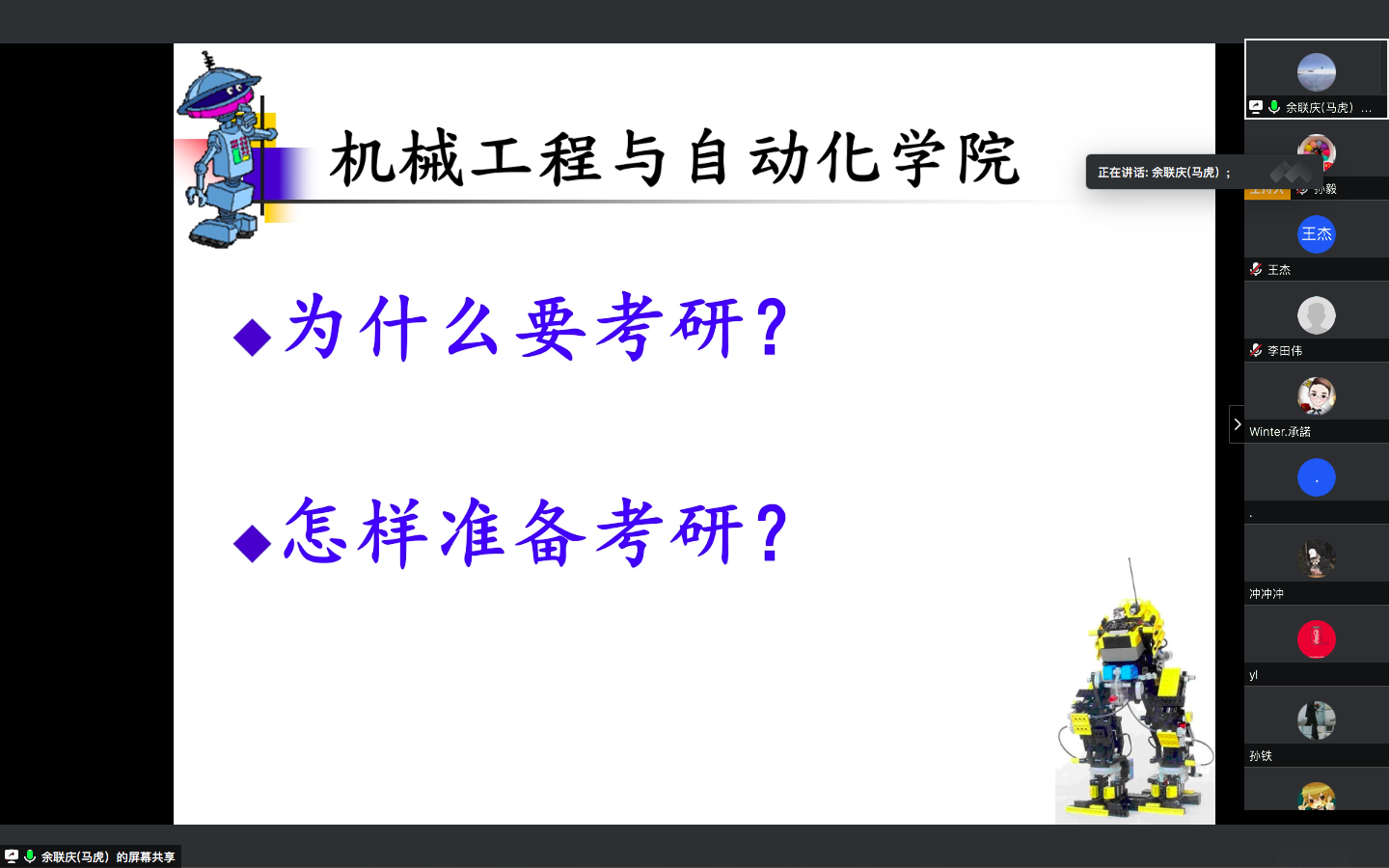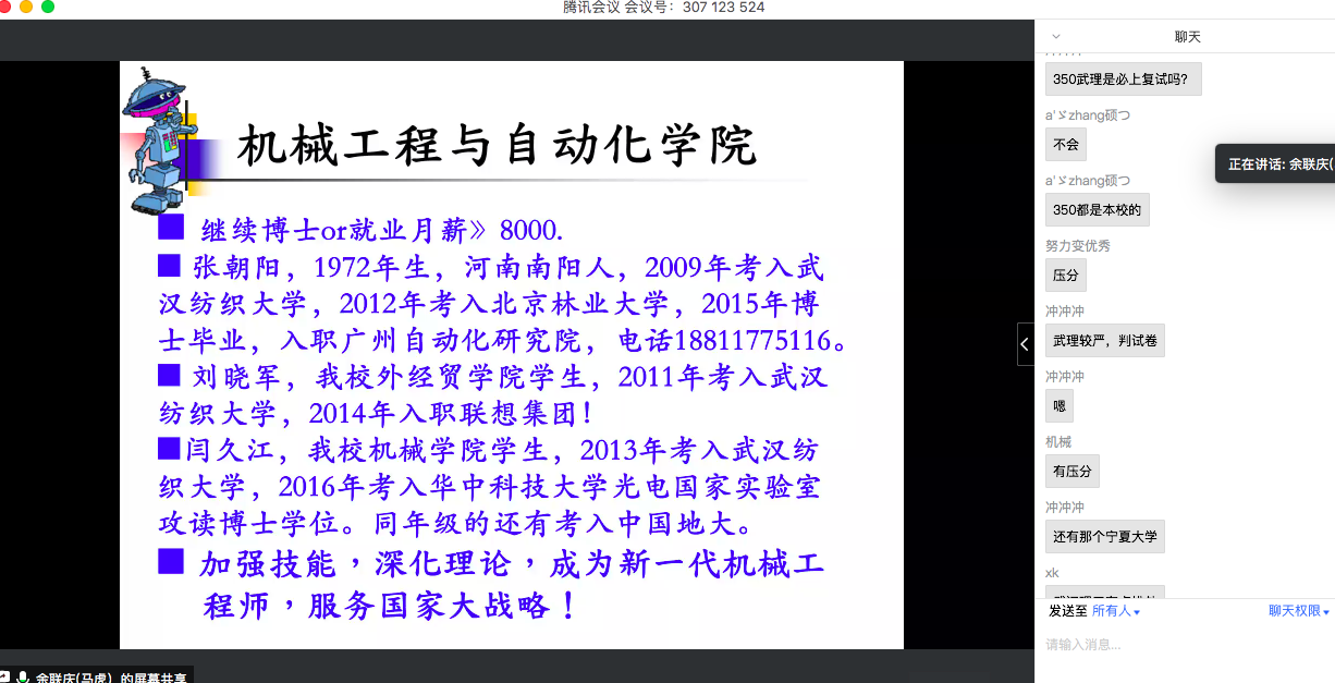 为让公司2017级本科生进一步了解考研、认识考研、明确目标、合理规划,增强继续深造的信心,积极做好考研备战。4月12日,060net永利利用腾讯会议在线召开了2017级考研动员大会。公司经理余联庆,2017级辅导员孙毅老师以及2017级同学参加了会议。