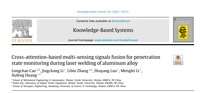 近日,060net永利青年教师曹龙超博士在激光加工智能监测方面取得了重要的研究进展。相关成果以“Cross-attention-based multi-sensing signals fusion for penetration state monitoring during laser welding of aluminum alloy”为题发表在计算机科学领域一区top期刊《Knowledge-Based Systems》(ISSN:0020-0255,IF=8.139)上。该论文的第一单位为永利官网,第一作者为060net永利曹龙超博士。