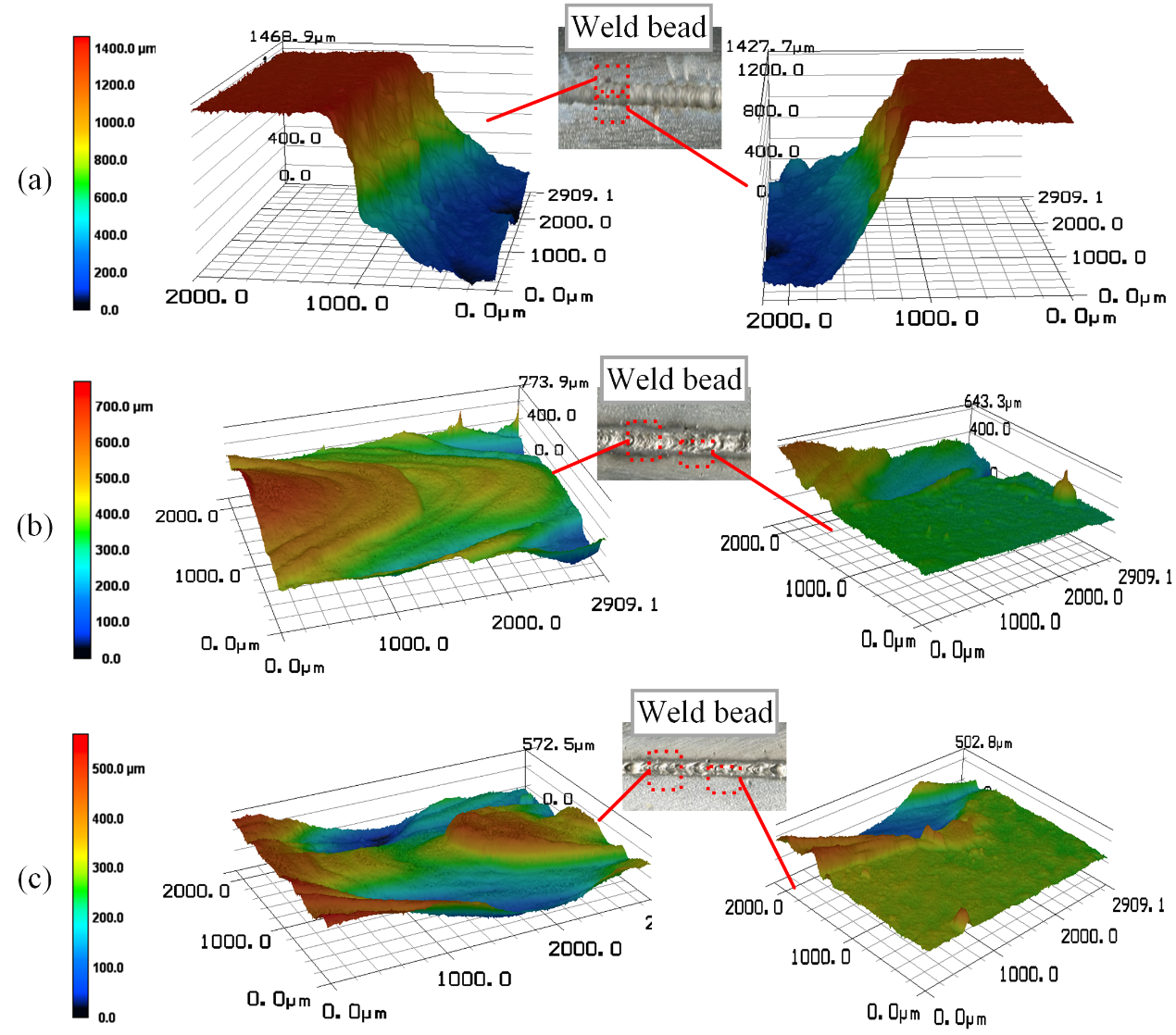 图1 光学显微镜和激光扫描共聚焦显微镜测量的焊缝形貌:(a) 过度熔透,(b) 未完全熔透,(c) 完全熔透