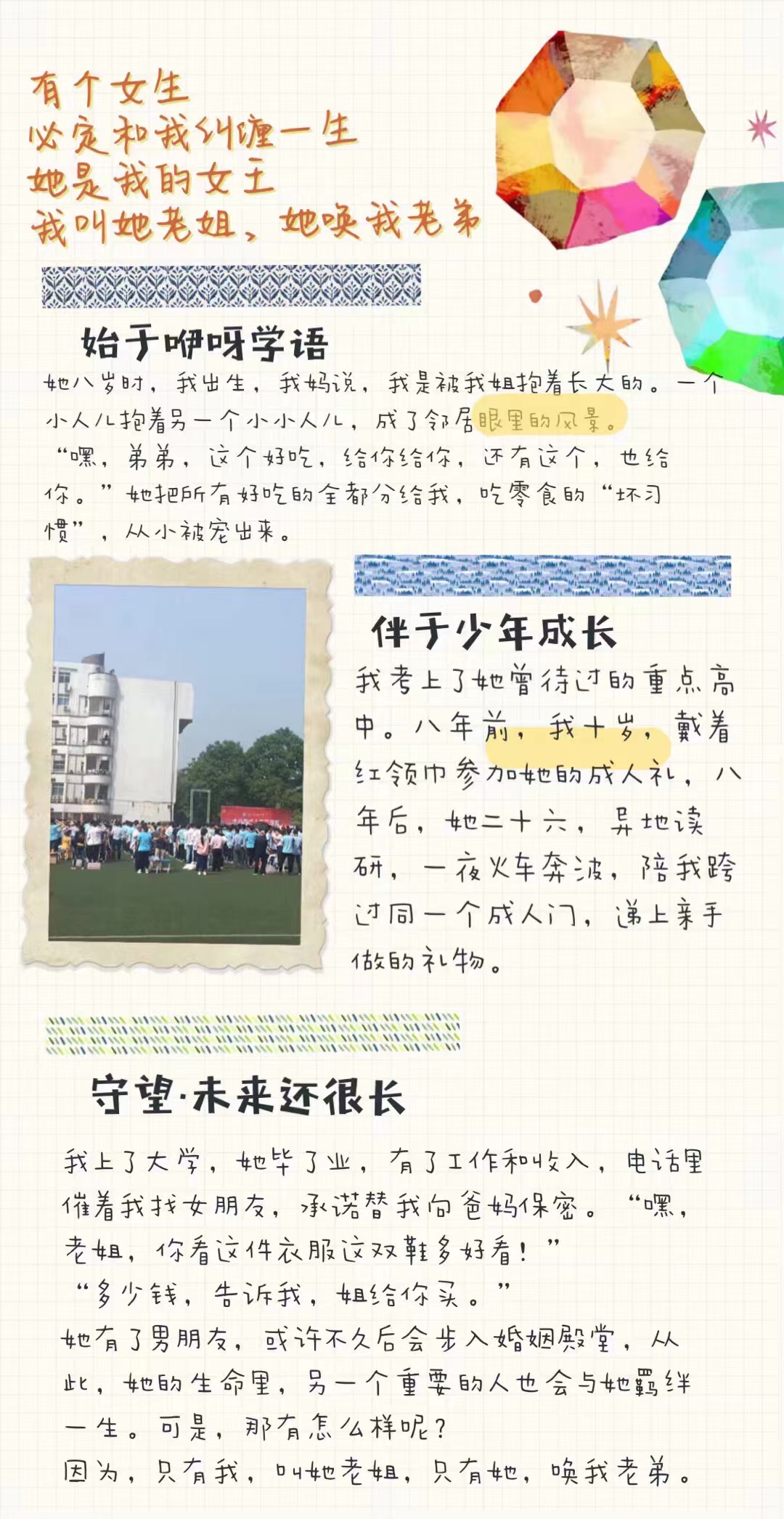 “她八岁时我刚出生,我妈说我是被姐姐抱着长大的。”这是弟弟对这段缘分最深切地感激与庆幸。共同成长,我们是最紧密的朋友;血脉相连,我们是最亲近的家人。未来还很长,愿你诸事顺利!