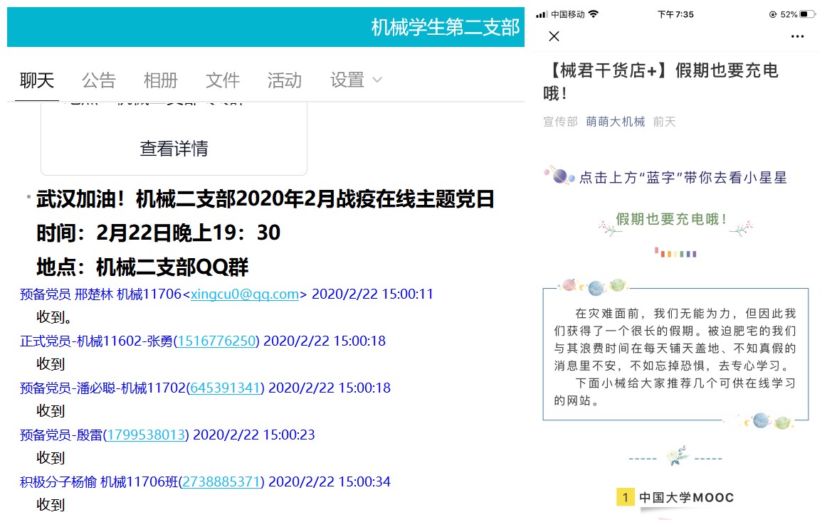 立足线上阵地,开展防疫宣传。充分利用公司微信公众号、QQ群,加大宣传教育的力度和舆论引导。及时发布省教育厅、公司及公司通知,持续发布关于疫情最新动态、防护措施、网课学习方法和心理咨询服务。公司新媒体“萌萌大机械”、“武纺机械志协”微信号至疫情暴发以来,共计推文50余篇,制作疫情主题视频1个,推送谢呈阳等多位志愿服务参与抗疫的员工典型,努力传递众志成城狙击疫情的坚定信心。
