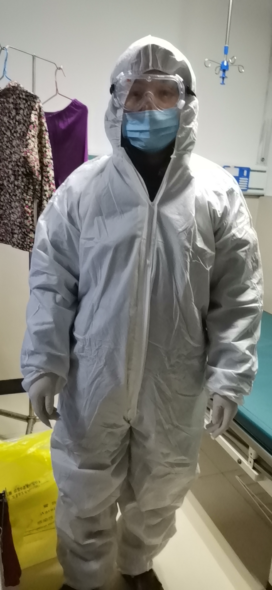 由于疫情发展迅猛,加之监利与武汉仅有两百多公里的距离,在汉务工人员和在汉员工人数较多,短短几天,医院准备的几百个床位都全部住满,这给医院的救治工作带来了不小的压力。医院库存的防护服和口罩很快就告急,最紧张时,大家用从文具店买来的塑料板自制面罩。在那段艰难的时期,胡耀春一边及时向上级报告申领物资,同时还发动身边力量为医院开展物资募集。作为医院的一名 “老医生”,他一直鼓励奋战在一线的年轻医生护士,要相信党和政府,相信全体中国同胞的支持,一定会尽快克服困难。