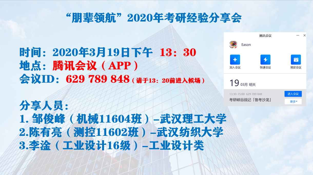 在分享交流环节,三名学长依次向同学们做了分享与交流。报考武汉理工大学的机械11604班邹俊峰同学向大家分享了他确定考研目标院校的经历,以及如何在备考阶段做好时间规划、总结学习方法,提高学习效率。同时,也向学弟学妹强调:只有保持一个良好的心态,坚持不懈、心无旁骛,才能最终成功上岸。报考公司研究生的测控11602班陈有亮同学向大家详细介绍了公司各专业情况、研究生就业前景、2020年研究生招考报考情况等信息。并提醒大家备考要不怕吃苦,多学多练、多总结,只有持之以恒才能取得理想的成绩。最后,工业设计11601班李淦同学向大家介绍了刷题经验、分享了英语单词记忆法,政治知识点联想记忆法等独特的学习方法,并建议该专业的员工在本科阶段应尽早开始画图练习,坚持多动笔,这样才能在专业考试中确保正常发挥。在互动答疑环节,借助在线问卷平台,邹俊峰等三名同学针对大家普遍关注的问题进行了详细解答。