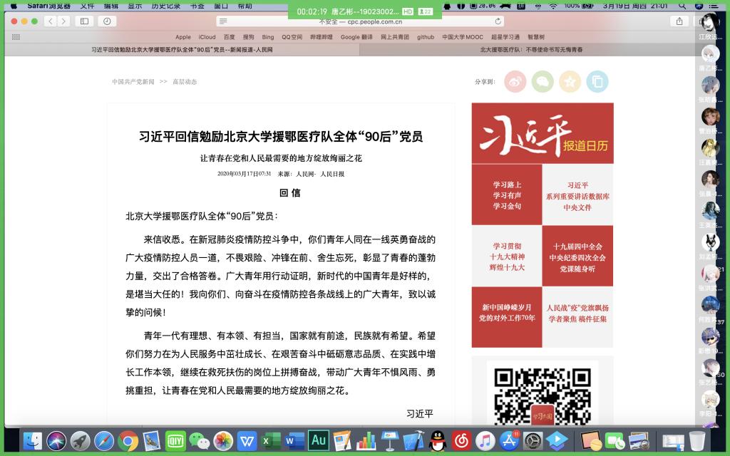 近日,根据团省委、校团委统一部署安排,为进一步学习习近平总书记给北京大学援鄂医疗队全体“90后”党员回信精神,强化团员青年的责任担当,060net永利组织开展了“学总书记回信,话青春担当”线上主题团日活动。全院54个团支部精心策划、认真组织,全体团员青年线上积极参加,氛围浓厚。
