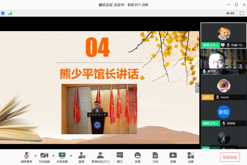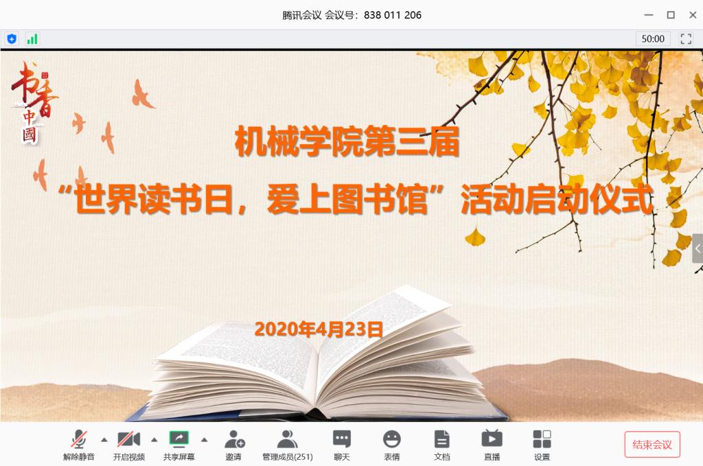 为迎接第25个“世界读书日”, 引导师生养成良好的读书品格,将阅读培养成一种生活态度与精神追求,060net永利组织开展了第三届“爱上图书馆”活动。4月23日,由于新冠肺炎疫情影响,活动启动仪式在线举行,公司肖信华书记、图书馆熊少平馆长,公司刘韦副书记,全体辅导员老师以及200余名员工代表参加了活动。