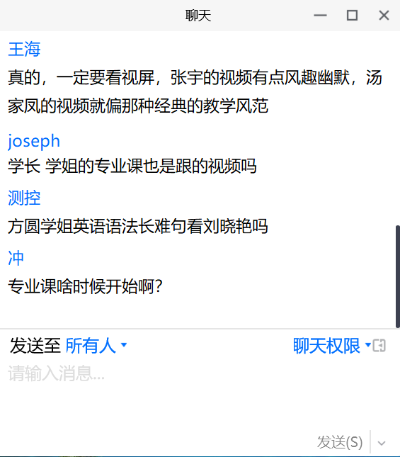 会上,三位考研成功的学长学姐分享了他们的考研经验和心路历程。从心态调整,时间安排,注意事项等方面,细致耐心地与到场同学进行交流。方圆学姐结合自己研究生入学以来的学习体会,告诉大家一定要首先明确自己为什么要考研,不能抱着试一试的心态,只有毫不动摇的坚定考研决心,才能在这场持久战中坚持到最后;王海学长向大家分享了自己在备考过程中复习数学的一些经验和教训,希望同学们能够尽快找到适合自己的学习方法;闵雅学姐向大家回顾了自己大学四年学习英语的一些体会,并交流了实用的单词记忆法、分享了一些高效的学习软件。同学们一边听讲一边积极的在线上与学长学姐进行互动交流,现场气氛热烈。