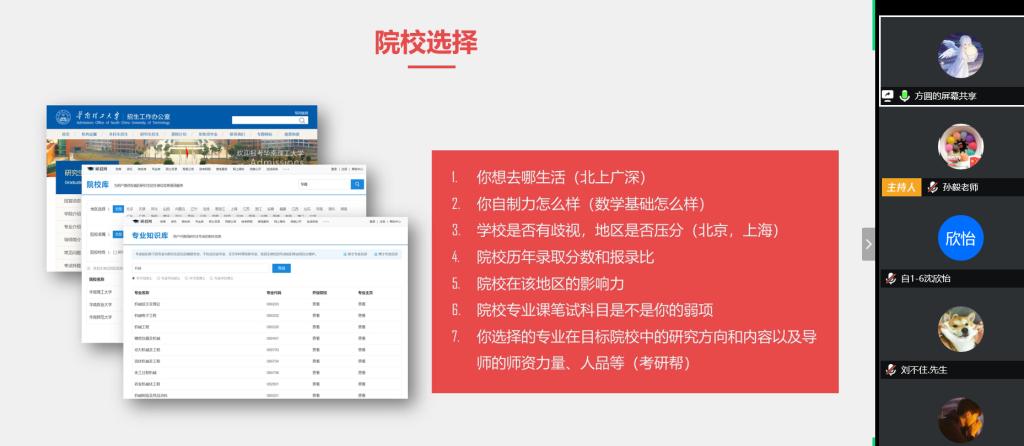 为了更好指导本科生的考研工作,帮助大家圆梦考研梦。4月22日,060net永利邀请了2015级机械优秀考研学子方圆(华南理工大学)、王海(东华大学)、闵雅(武汉理工大学)等三位同学,在腾讯会议平台向2017级同学做考研经验分享。