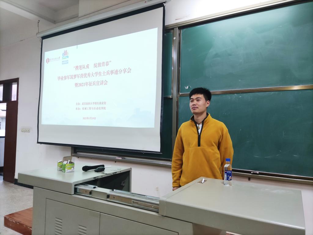 会上,2021届刘冯向大家分享了在祖国西南边防线服役期间生活训练的点点滴滴,用青春与奋斗诠释清澈的爱只为中国。2019级杨青松,服役期间多次代表祖国参加联合军事演习,在国际舞台展现出了良好的军事素质与军人作风。2021届毕业生韩杨,在2021年研究生考试中,顺利通过士兵专项计划被永利官网录取,他向大家详细介绍了士兵专项计划政策,并分享了自己考研复习的经验与建议。