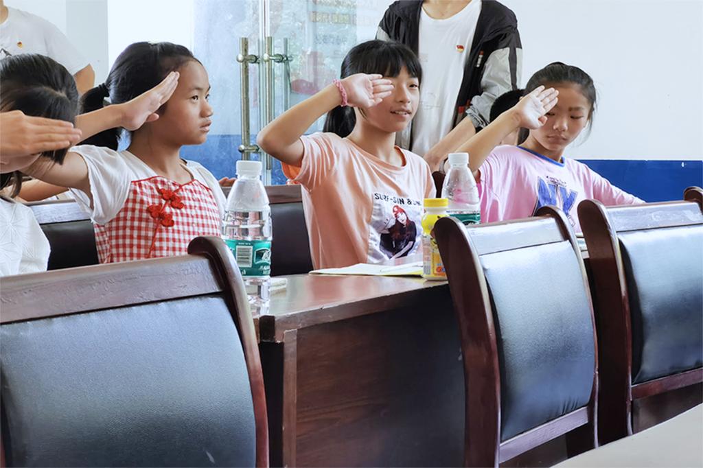 孩子们认真学习少先队敬礼手势