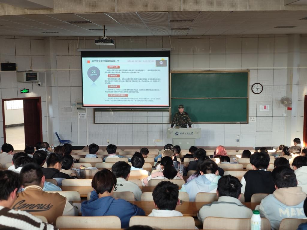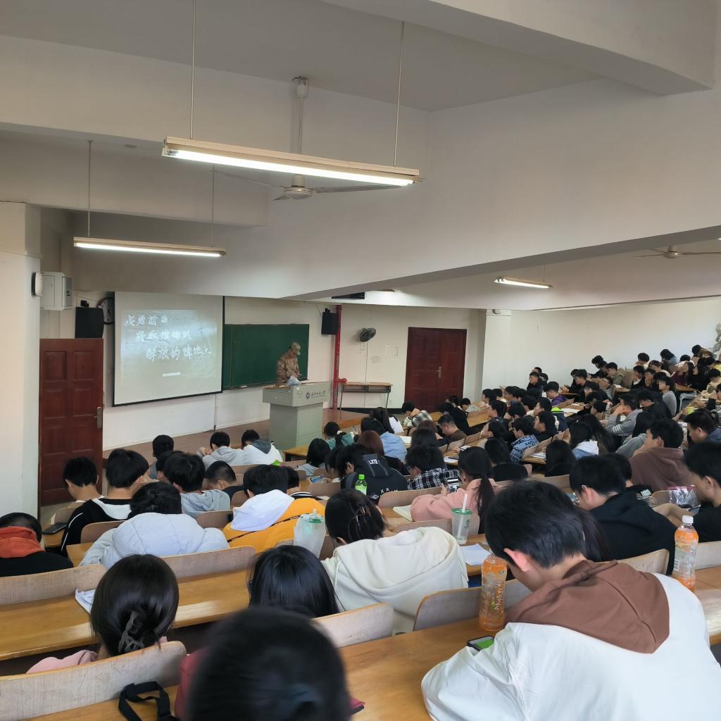 为活跃气氛,宣讲会设置了军事常识有奖竞猜环节,考查大家对中国人民解放军武器装备和军事历史的了解和认识,同学们纷纷积极参加互动,并获得了精美的定制纪念品。而后,方林老师以“投身火热军营,创造精彩人生”为题,从征兵流程、经济补助、政策优待、个人职业发展等多方面对老员工士兵参军入伍进行了详细解读。同时,通过往届参军入伍学长考取军校继续深造、通过士兵计划成功读研以及入伍期间参加各项军事行动等事例让大家感受到参军入伍、报效祖国与当代老员工的紧密联系。