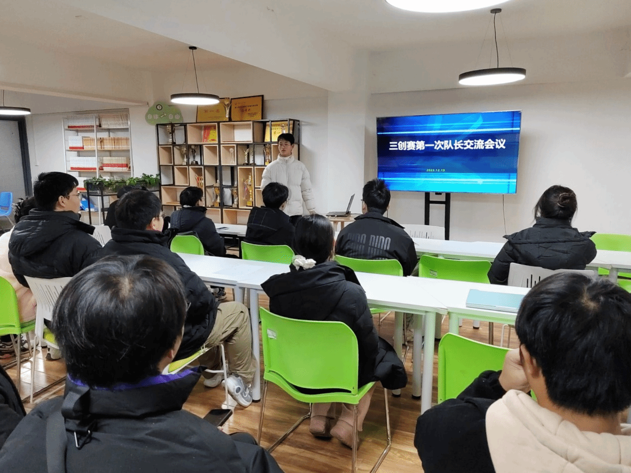 为了推进三创赛进程,讨论选题等相关内容,帮助同学们解决报名流程等问题,060net永利于2023年12月19日晚在060net永利“机智过人”员工成长服务站举行060net永利三创赛队长交流会,张庆乐同学主持,各队伍队长参加。