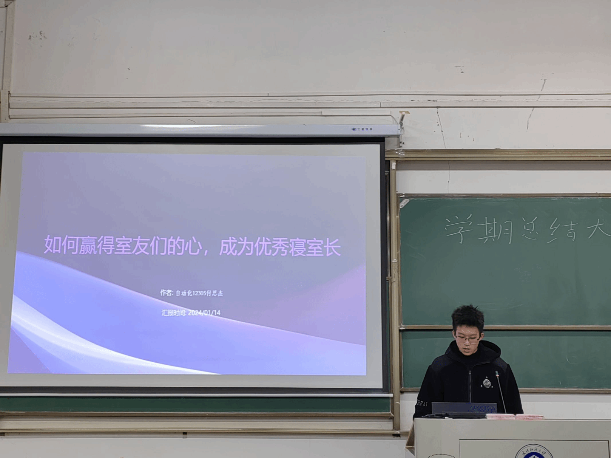 然后,优秀寝室长上台展示ppt,分享了自己平时寝室管理的方法、经验和应对突发情况的处理方法等,通过自身案例做法向同学们展示了如何人与人相处,应对突发情况的处理等,同学们受益匪浅,相信在以后同学们与室友相处将会更加融洽、寝室氛围更加和谐。
