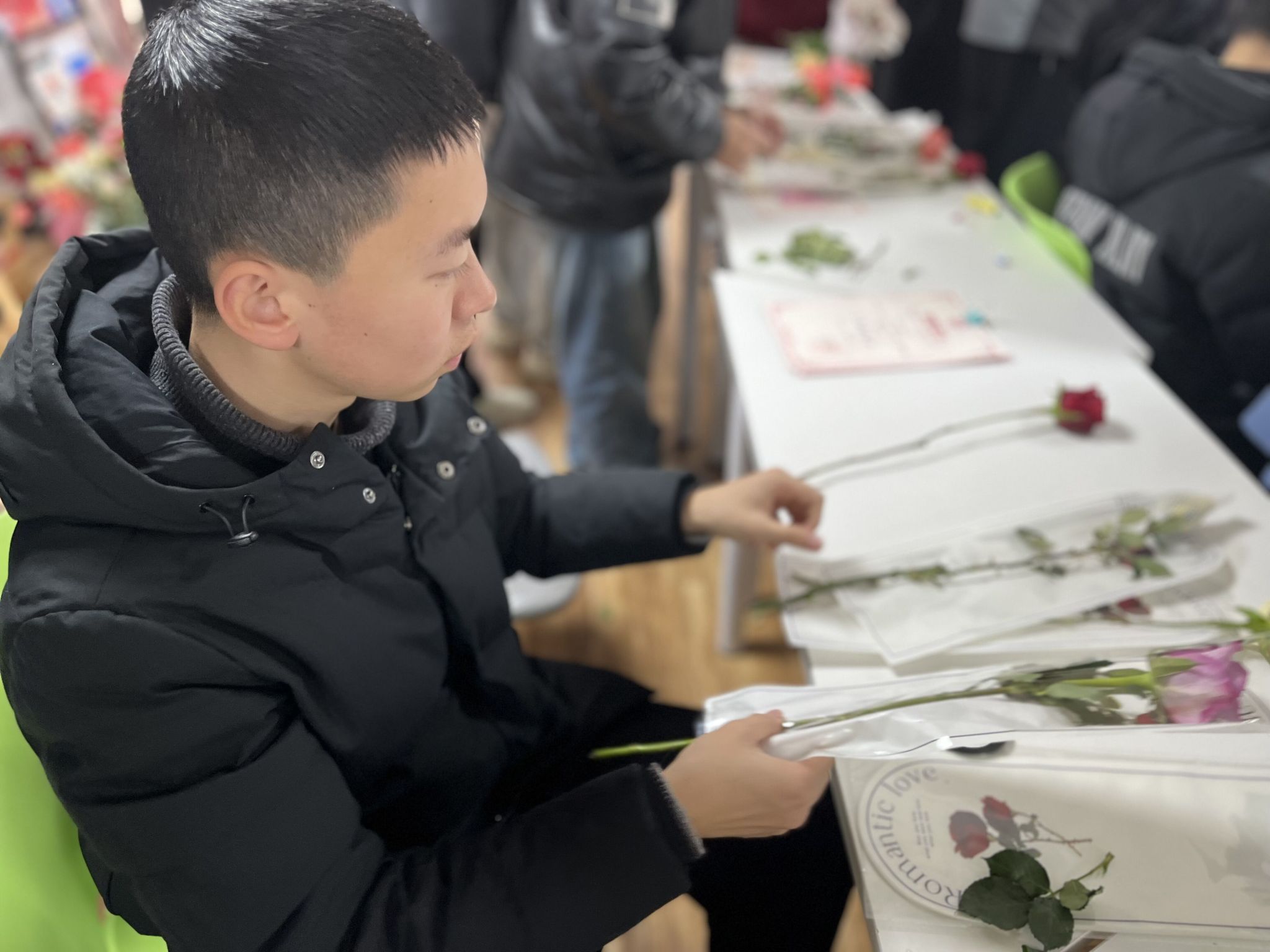 在制作过程中,大家一直激情高昂。有不少同学因为是第一次进行花束制作,动作不熟练,被花刺刺中很多回,但同学们都毫无怨言,脸上一直洋溢着笑容。经过大家的努力,一朵朵花被制作包装成了一束束精美花艺礼品。